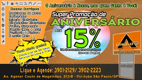 No mês de Abril a Arkad's Serviços Automotivos faz Aniversario. O Anivesario é nosso, mas quem Ganha o Presente é você! Você pode ganhar até 15% de desconto em todos os nossos serviços. Ligue e se informe. (11)3901-2129 ou (11)3902-2223